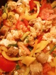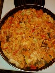 4. In the same skillet add your chopped or diced onions, mushrooms, carrots, tomatoes and hot peppers until onions become translucent, sweet peppers are shimmery.