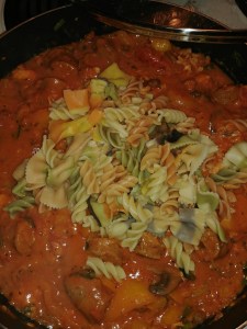 6. When the spiral and bow tie vegetable pasta is cooked, add them to the skillet and mix.