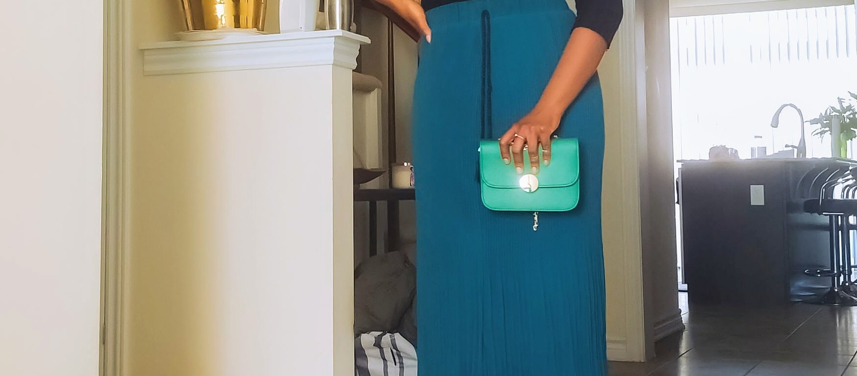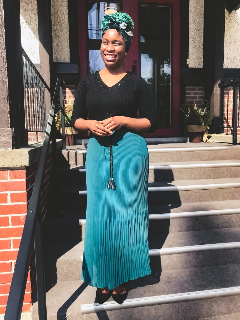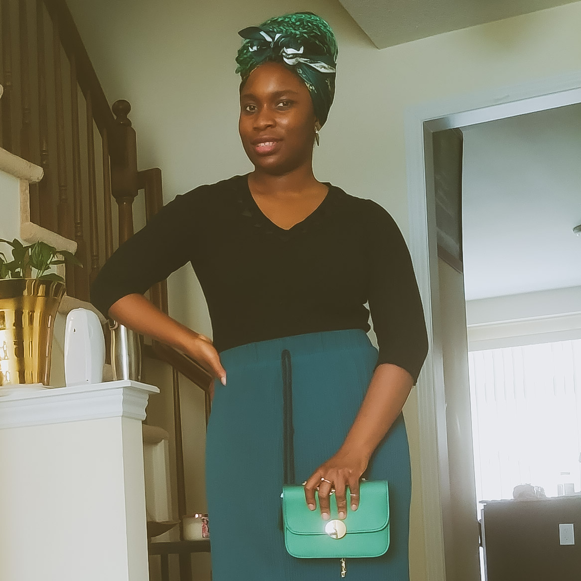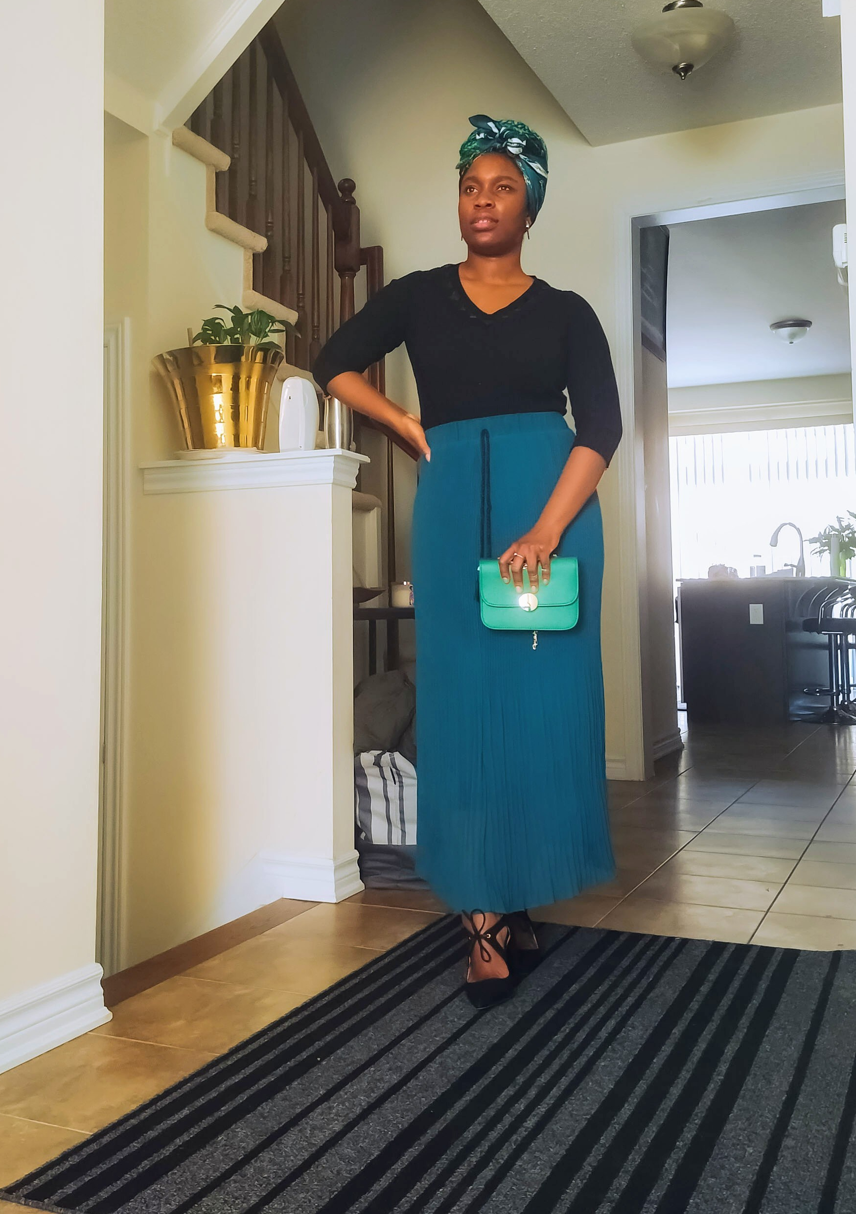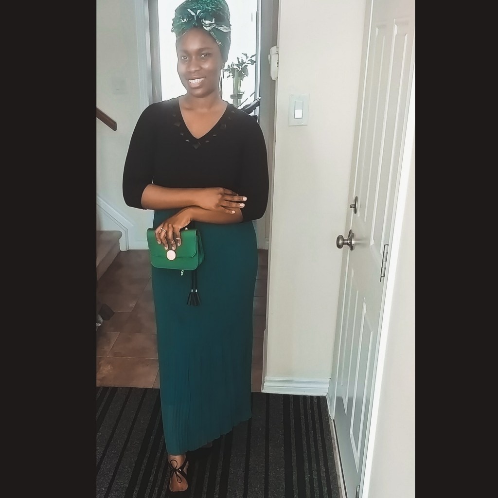 I love vintage fashion because it has its way to enchant and add a unique taste to one’s personality. Why not welcome Spring with your version of looks with a pleated skirt as the main attraction of course. Fashion is all about experimenting, with the confidence you can become unstoppable from styling looks that will get people in ‘awe.’ This emerald pleated skirt was my Sunday’s Best this weekend. The skirt, earrings, head-tie and handbag were gifted to me last Christmas 2019. My sister and Bro-in-Law purchased them from shein. Unfortunately, my skirt was not on the site, but the link takes you to similar types of pleated skirts https://ca.shein.com/?ref=www&rep=dir&ret=ca. I paired it with a black quarter sleeve top and my favourite classy suede heels from @justfab. This complete look not only feels comfortable and airy. It looked vintage and refined.